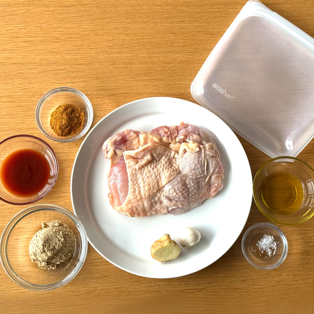 1. 生姜、にんにくはすりおろし、鶏肉は4〜5等分にする。密閉袋に鶏肉以外の材料を入れて、まぜ合わせる。