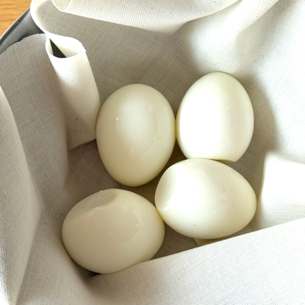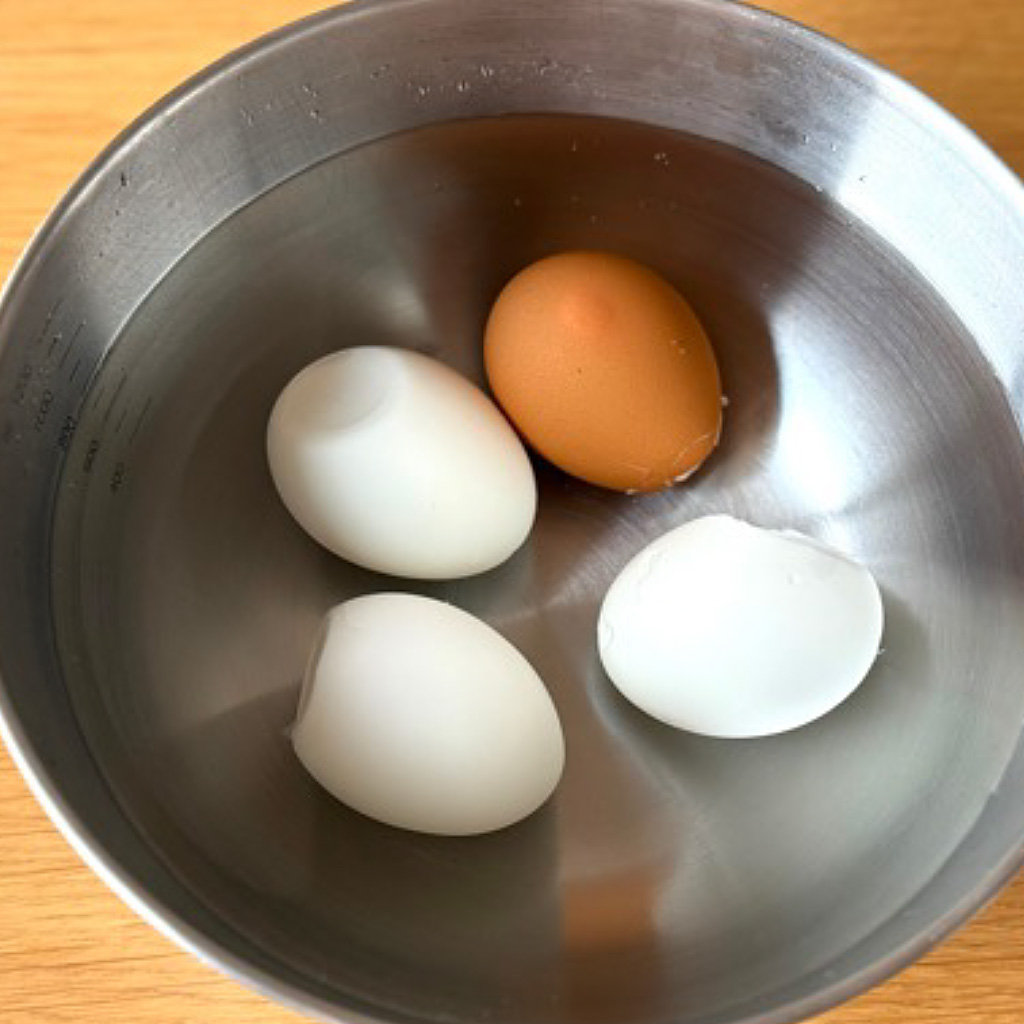 1. ゆで卵は殻をむき、水気を拭く。(水の中できれいにむけます)※衛生上、卵は固茹でにしてください。