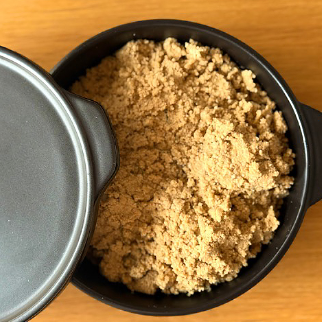 2. 雪室ぬかを容器に入れて、卵を入れる箇所にくぼみをつくり、ゆで卵を入れぬかをまぶして埋める。