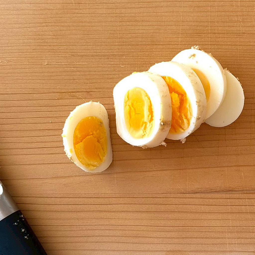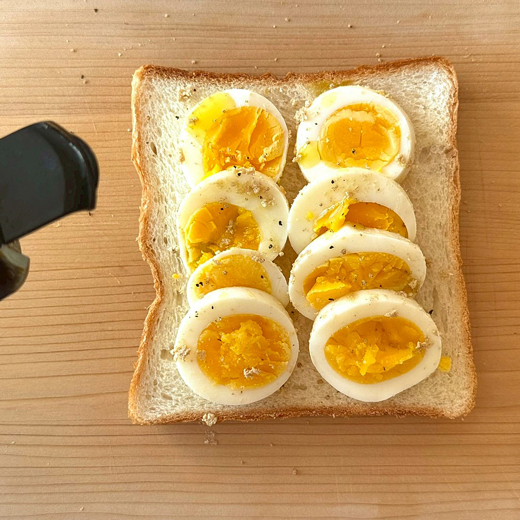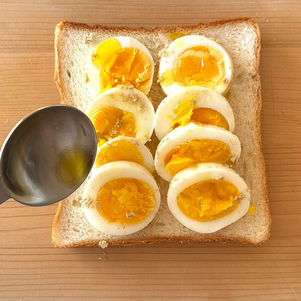 1. ぬか漬け卵をうす切りにして食パンに並べる。
