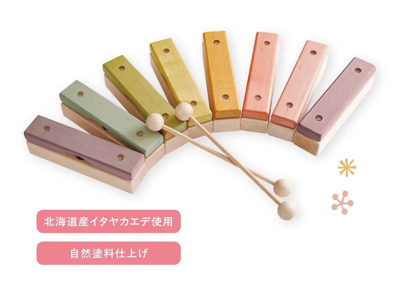 虹をイメージした優しい色合いと、木製品ならではの質感がお子さんの感性を育む「虹色木琴」。職人が1本1本手作業で調律した、本格タイプの木琴です。