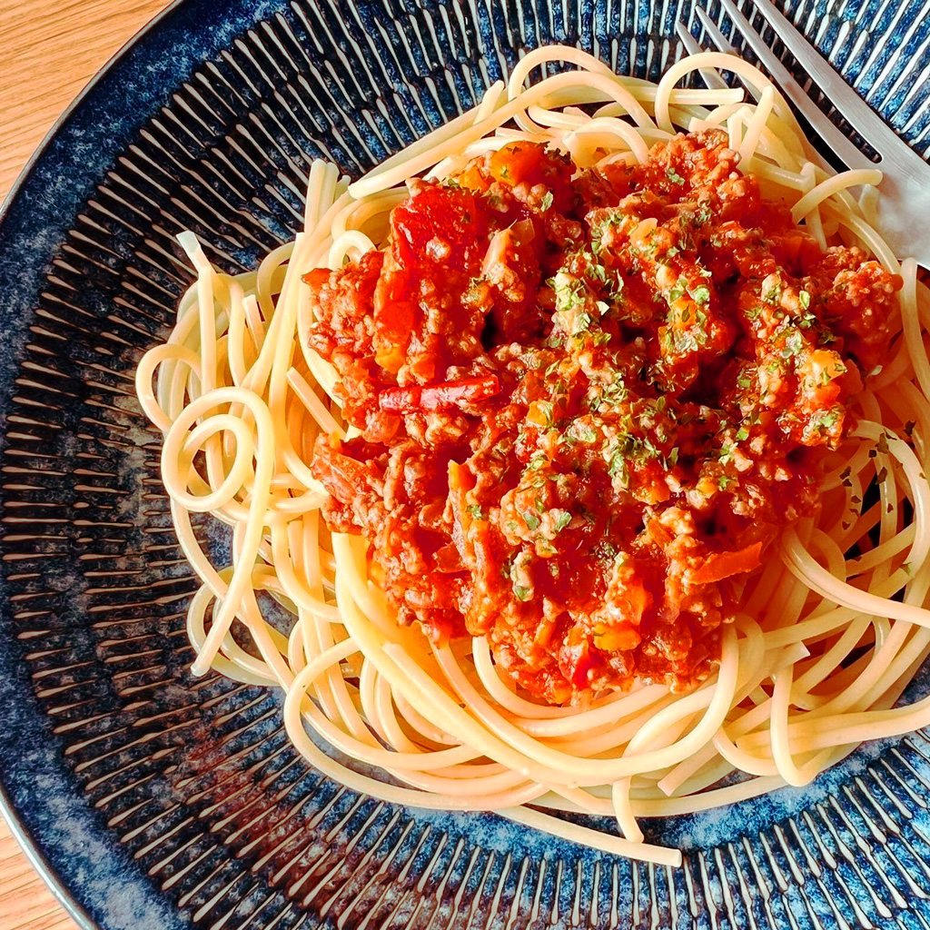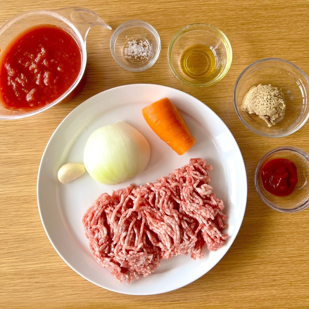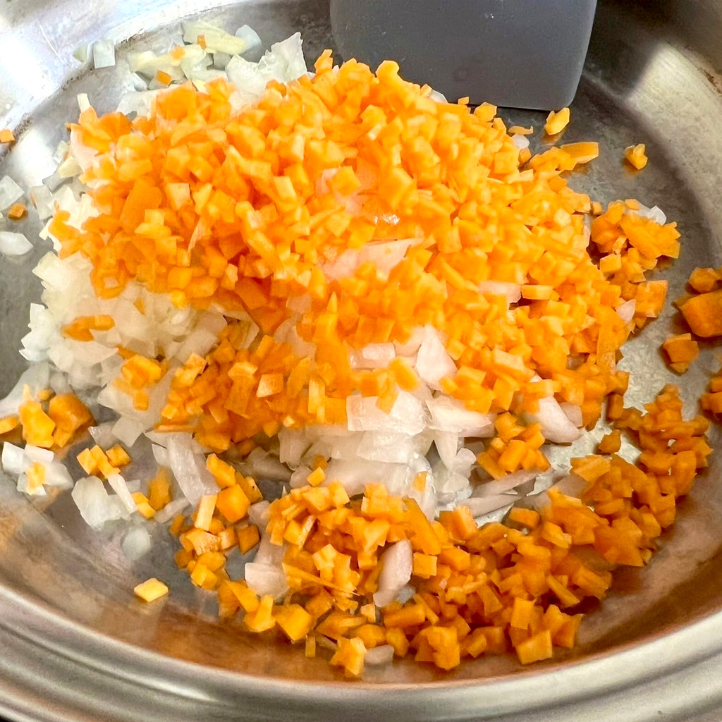 1. フライパンにオイル、みじん切りにした玉ねぎ、にんにく、にんじんを加えて炒める。
