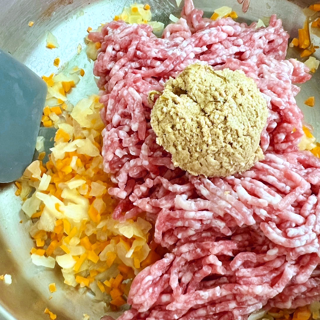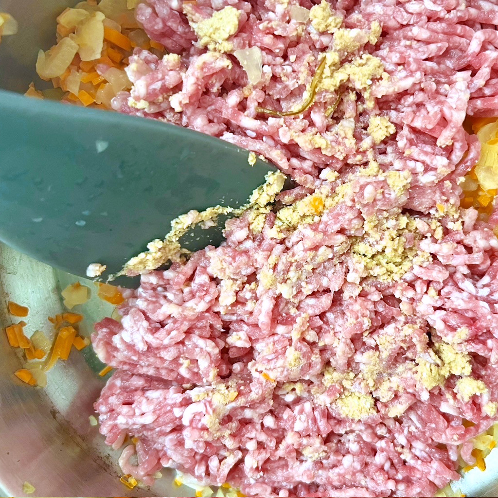 2. 豚ひき肉、雪室ぬかを加えてほぐしながら混ぜ炒める。