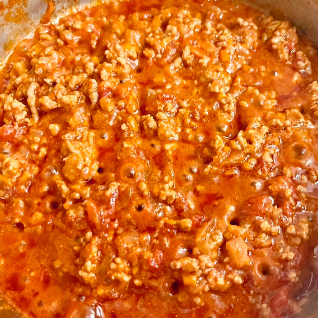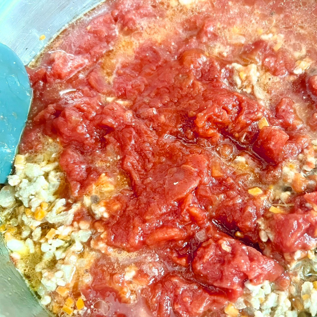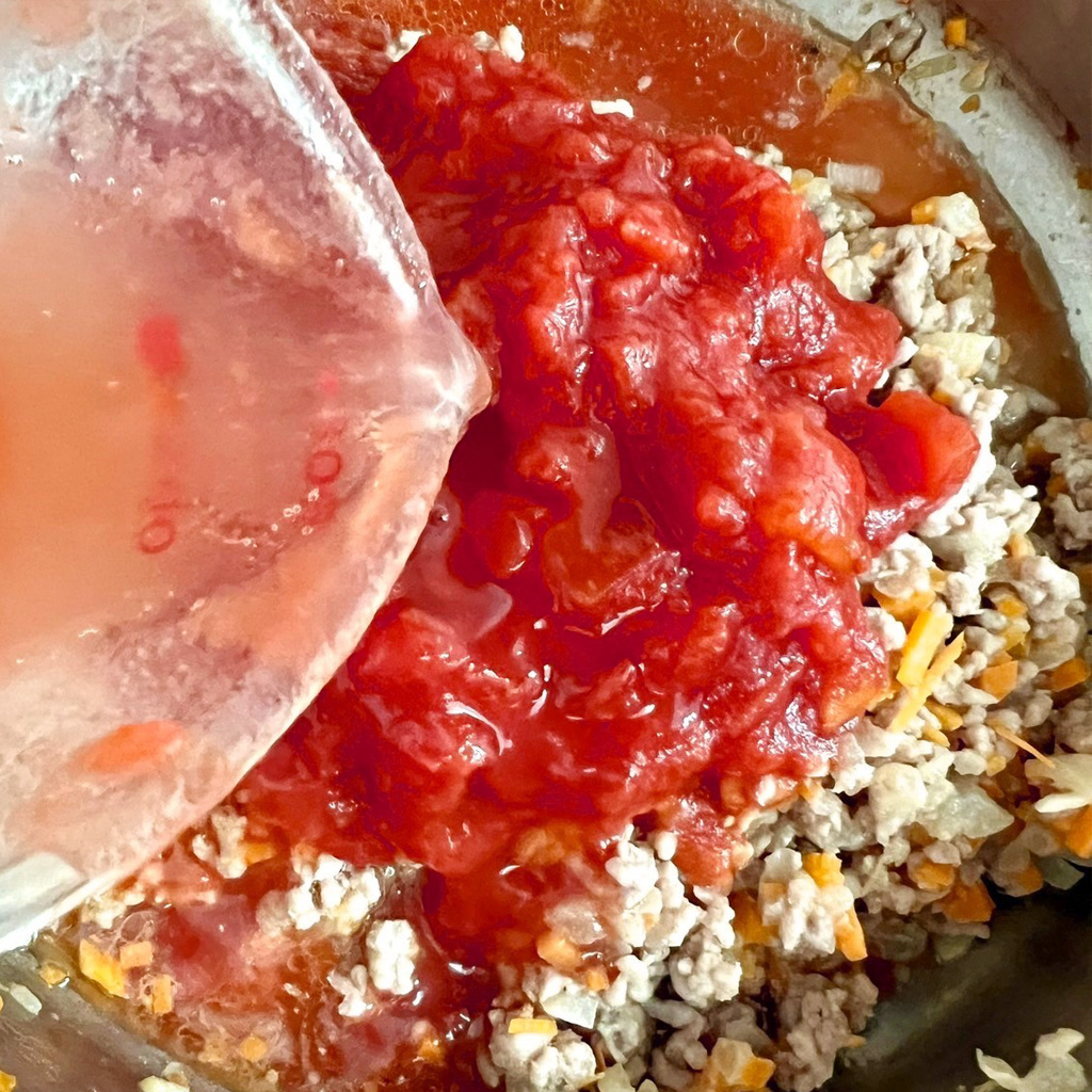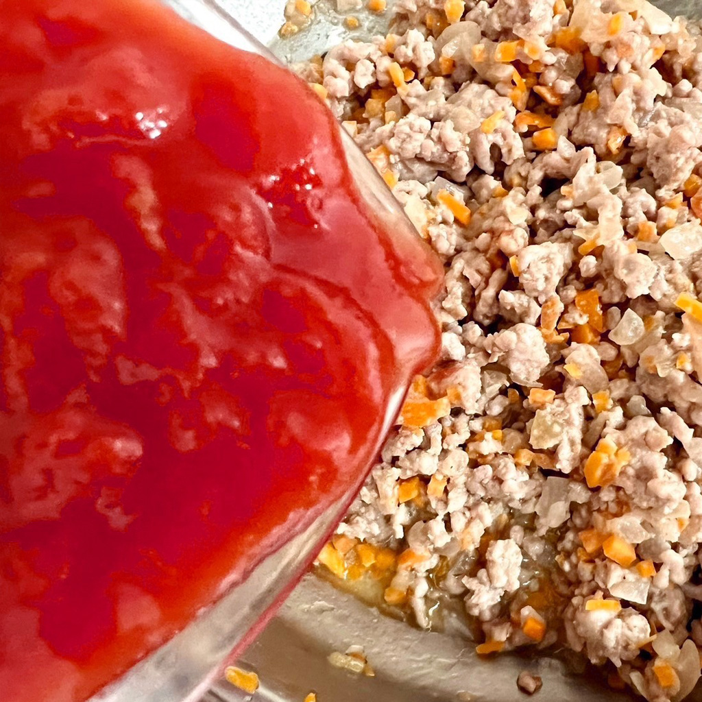 3. トマト缶、水100mlを加えて煮込む。煮詰まってきたらケチャップ、塩コショウを加える。