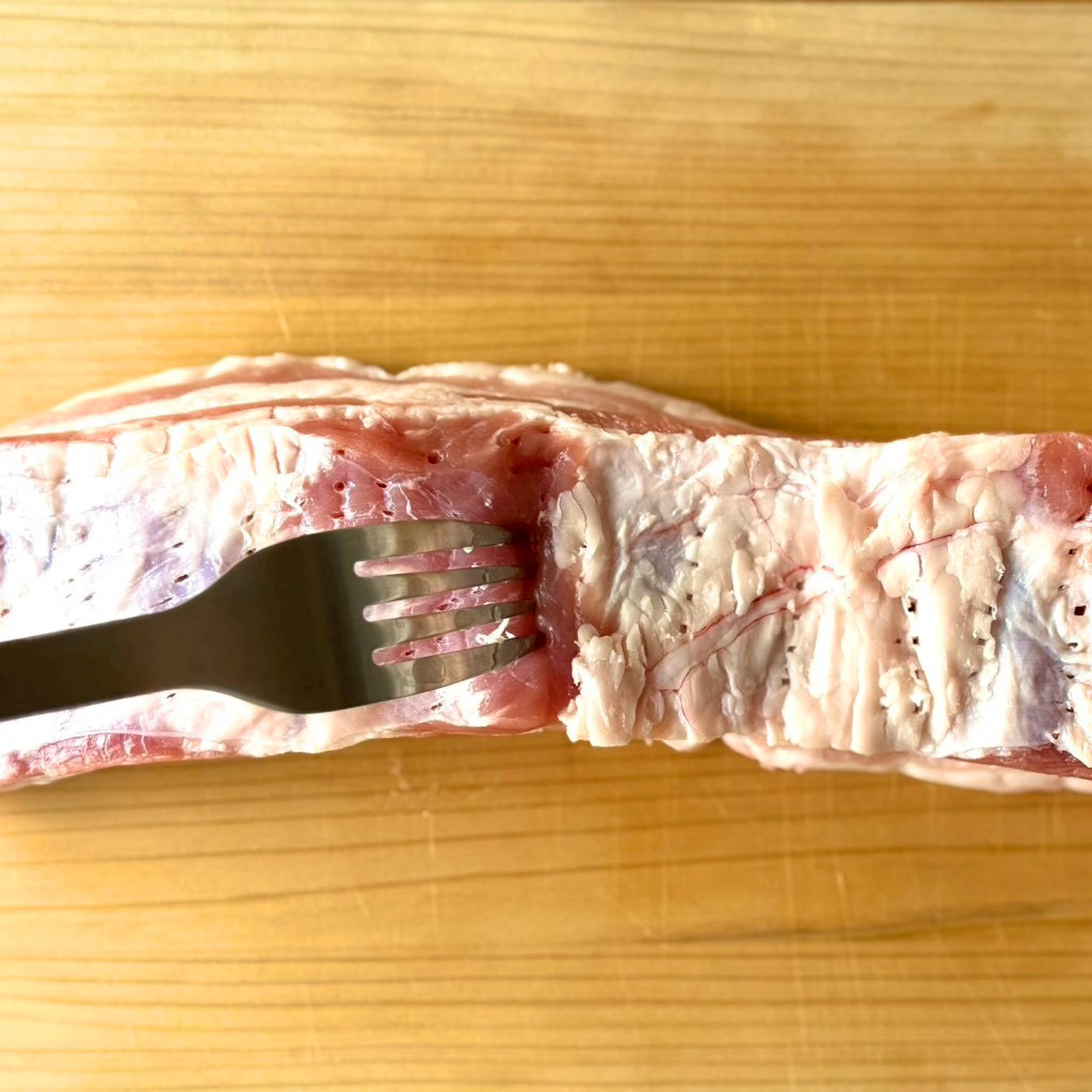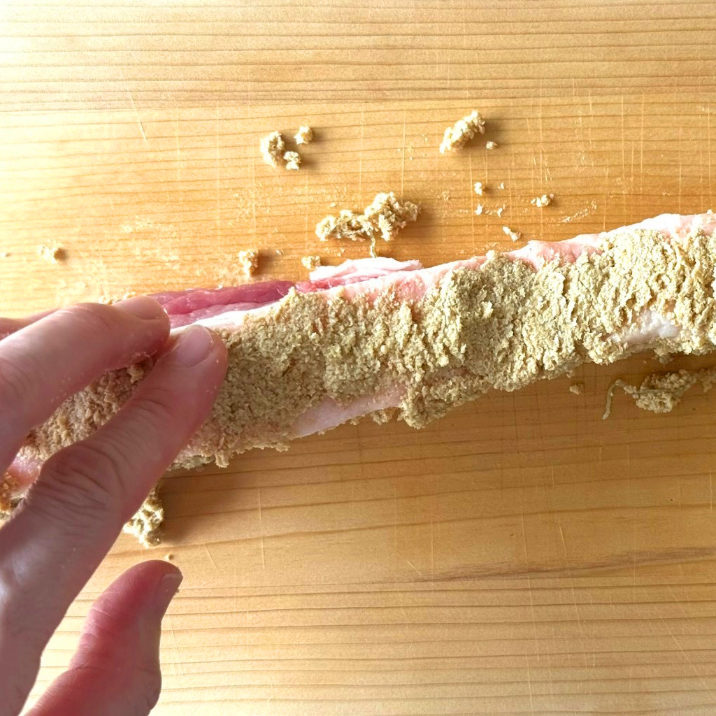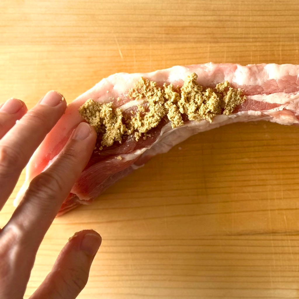 1. 豚肉は表面に穴を開ける。ぬかをまんべんなく塗りつける。