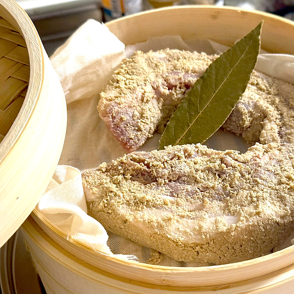 3. 蒸気の上がったせいろに晒し布をしき豚肉を入れ、ふたをして30分ほど蒸す。