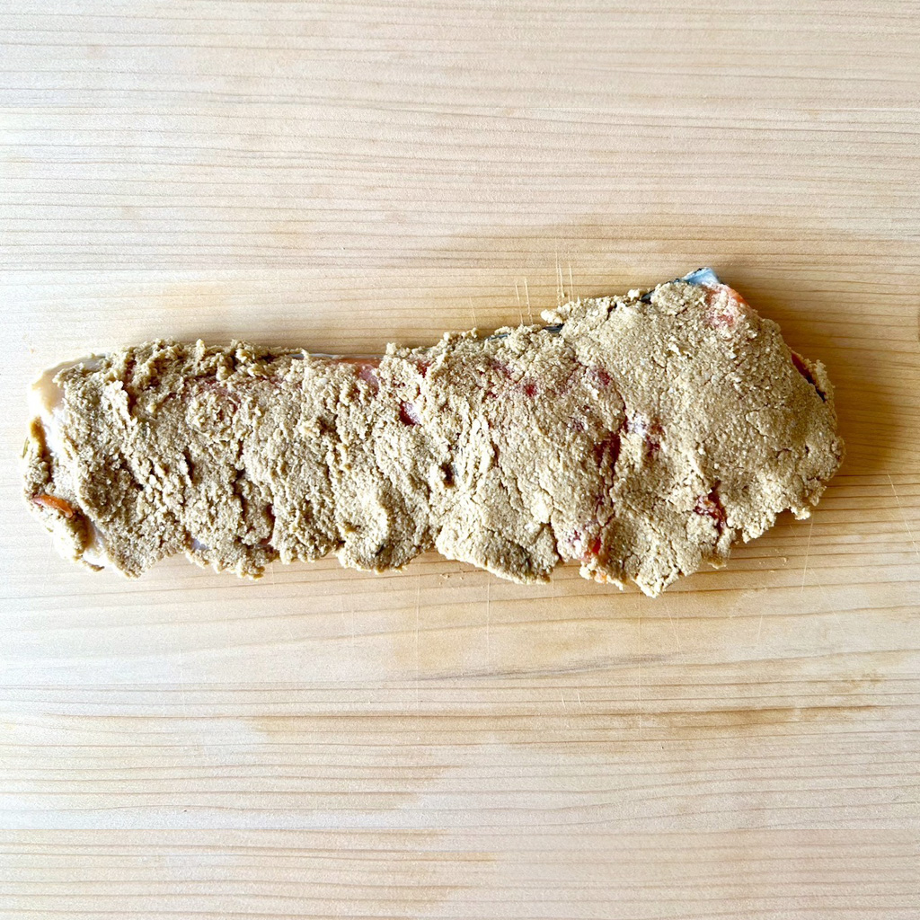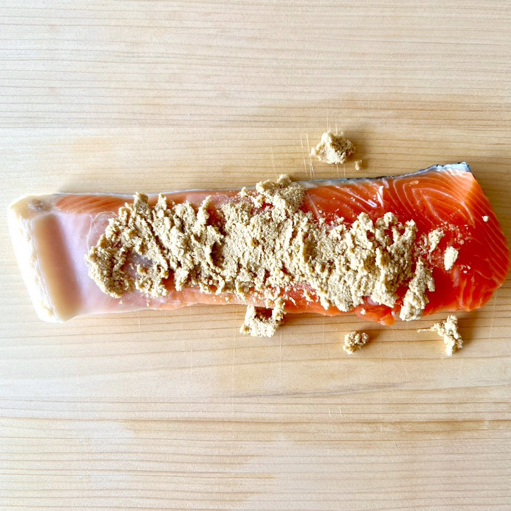 1. 秋鮭は水分を拭きとる。身の両面にぬかを塗る。皮の部分も忘れずに。