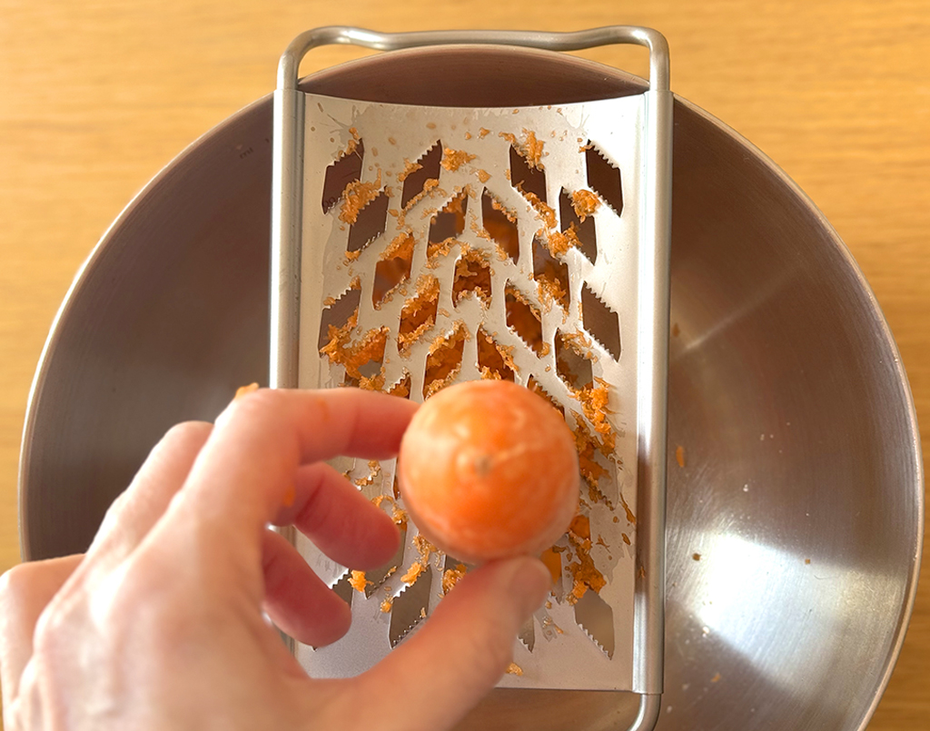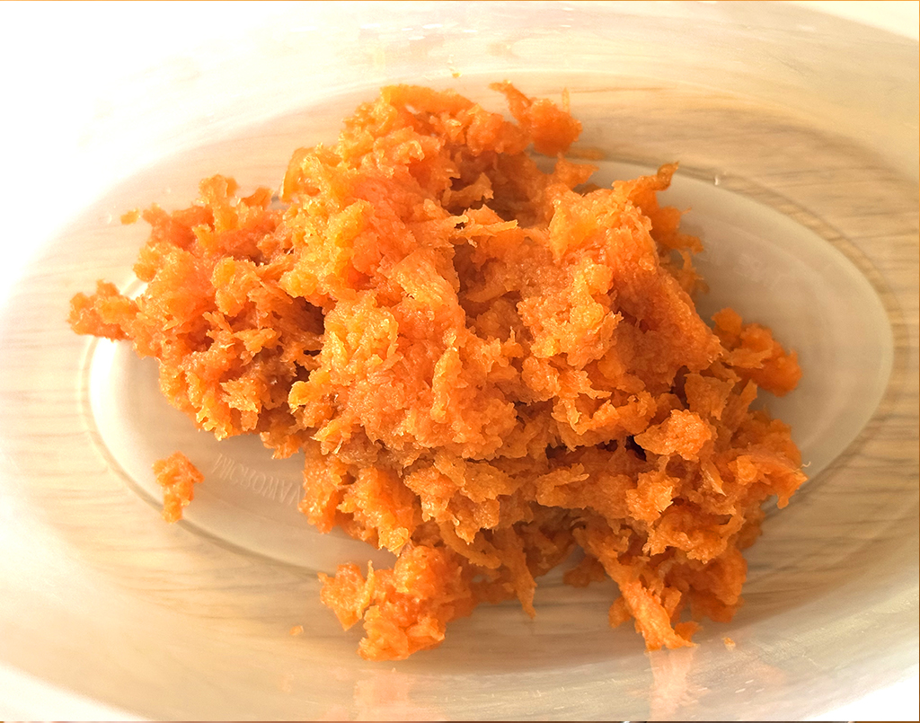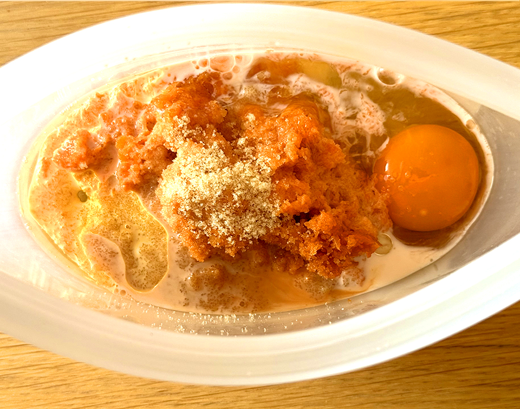 1.にんじんをすりおろす。スタッシャーに入れ、卵、牛乳、砂糖、油を加えてなめらかになるまで混ぜる。