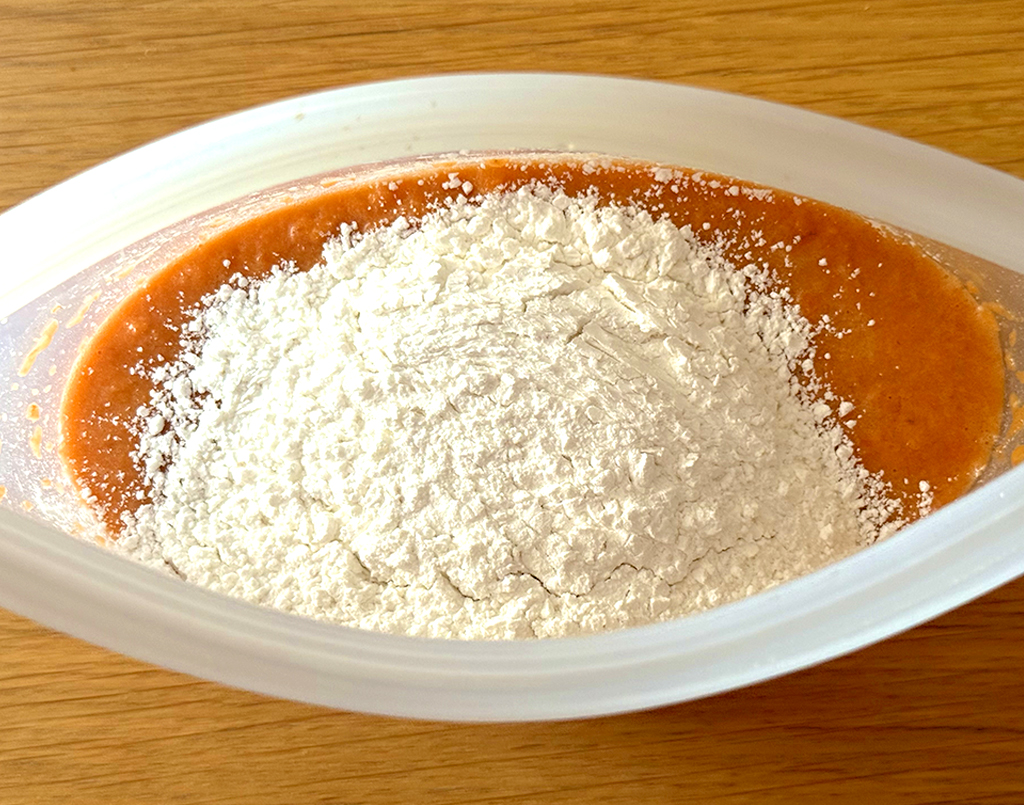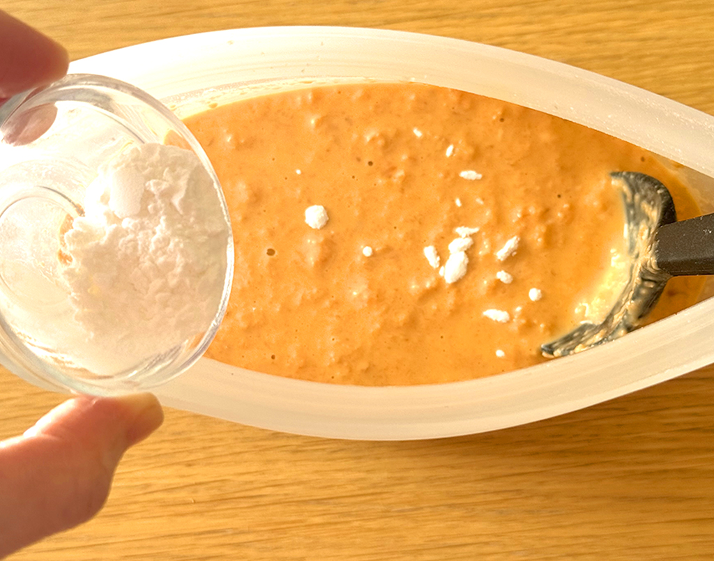 2. 米粉を加えて混ぜ合わせたら、最後にベーキングパウダーを加えて混ぜる。