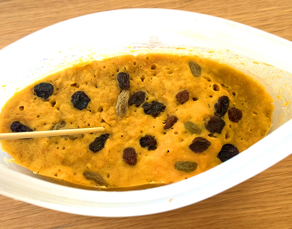 3. レーズンをのせて、口を開けたままレンジ600Wで5分加熱する。