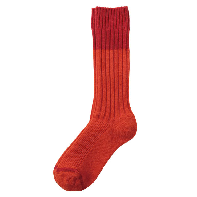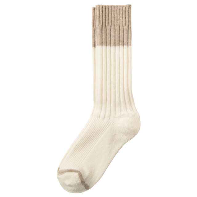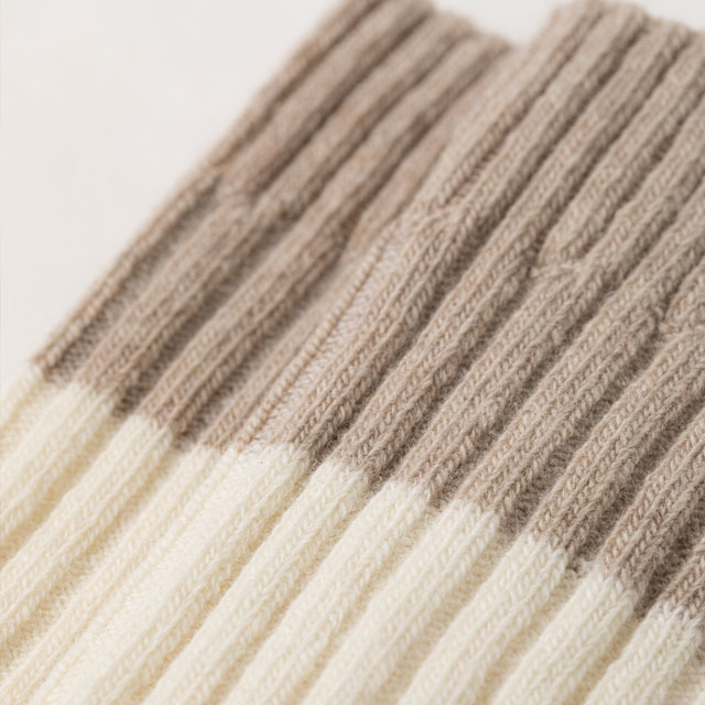 | 特徴 | ゆるめのストレッチ糸を使用し、贅沢で暖かい靴下。定番のリブソックスもツートーンでいつもと違う表情に。 |