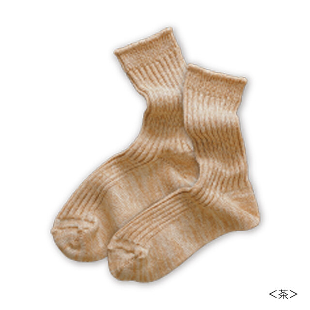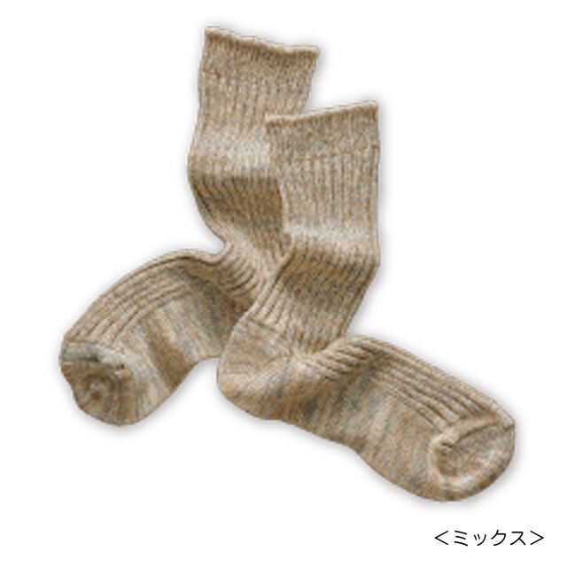 | 特徴 | オーガニックコットンでつくった、ローゲージリブ編みのほどよいフィット感が心地よい靴下です。カラー糸×生成り糸色がミックスされて、カジュアルに使えるツイード調に仕上げました。 |
