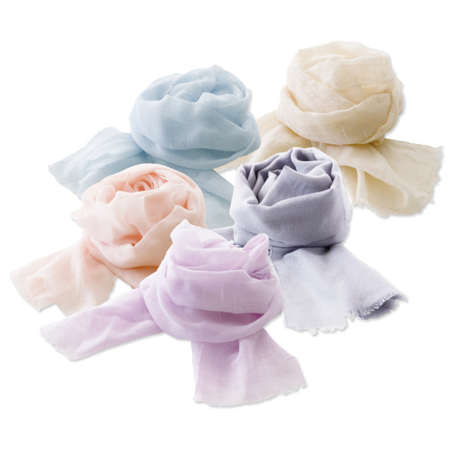 織りから染色、仕上げまで今治で生産しています。細い糸で織りあげるガーゼ生地は重量わずか36g、巻いているのを忘れるほどの軽さです。 ¥汗ばむ季節は吸湿性とUVカットに優れ、冬は二重巻きで温かく一年を通して役立ちます。ご家庭で手洗いができ、お手入れ簡単。普段使いにどうぞ。