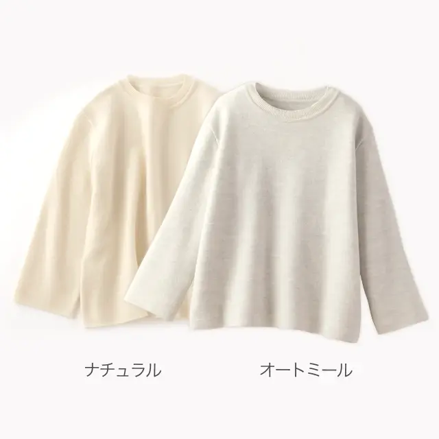 程よいAラインのゆったりシルエット。襟ぐりのリブの縁には、顔まわりにさりげない華やかさを添える繊細な透かしホールが編み込まれています。素材本来の優しい風合いを大切に、ひと手間かけた丁寧なものづくり。上品でふっくらとした表情と軽い着心地のプルオーバーです。